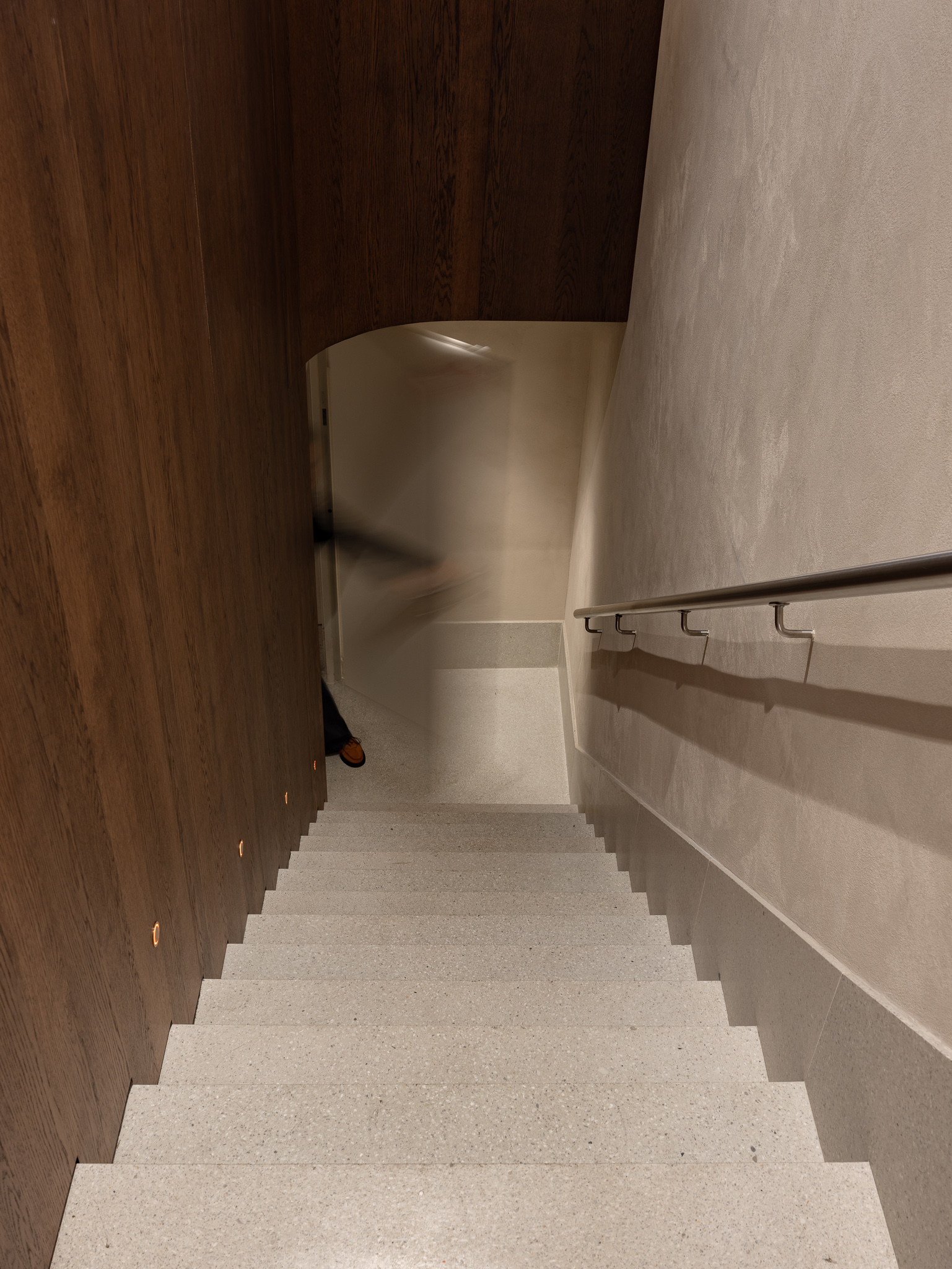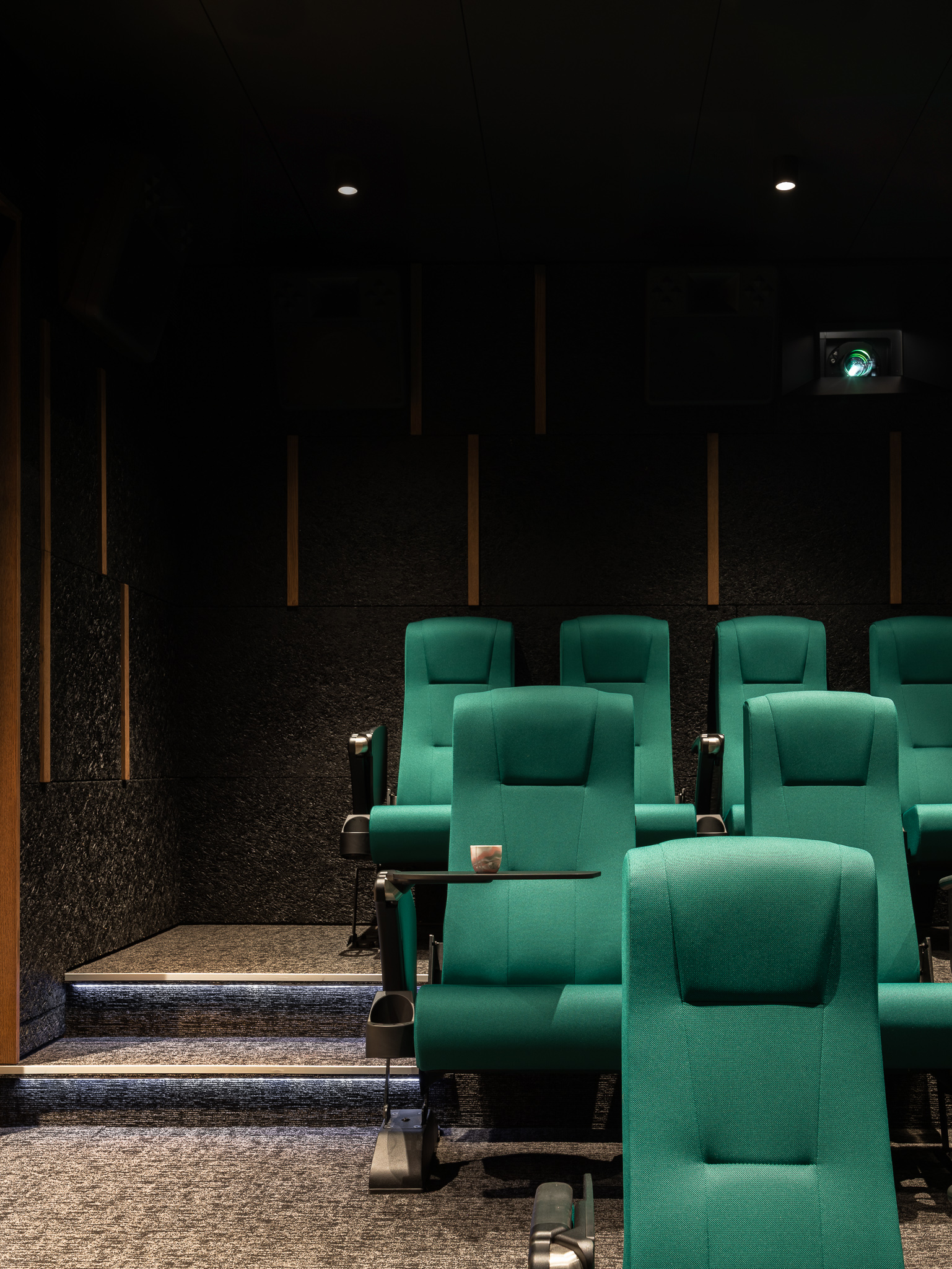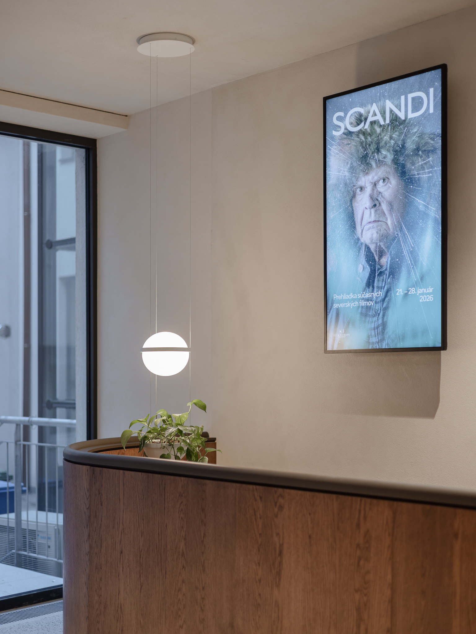 Malá sála je prístupná aj druhým schodiskom priamo z kaviarne, čo umožňuje flexibilné prevádzkové režimy. Priestory sú neutrálne, s dôrazom na kvalitu a dlhodobú udržateľnosť použitých materiálov, ako aj na minimalizáciu ich ekologickej stopy. Použité terrazzo je vyrobené z recyklovaného plastu a ľahko udržiavateľné omietky neobsahujú syntetické materiály. Kontrastné prvky tvoria drevené zábradlia a nadrozmerné dvere do kinosál. Naopak, samotné kinosály sú tmavé, so zelenými sedadlami; tmavo morené drevo tu vytvára kontrastný a zároveň akustický prvok s jemným prekvapením v podobe decentného podsvietenia.